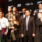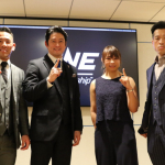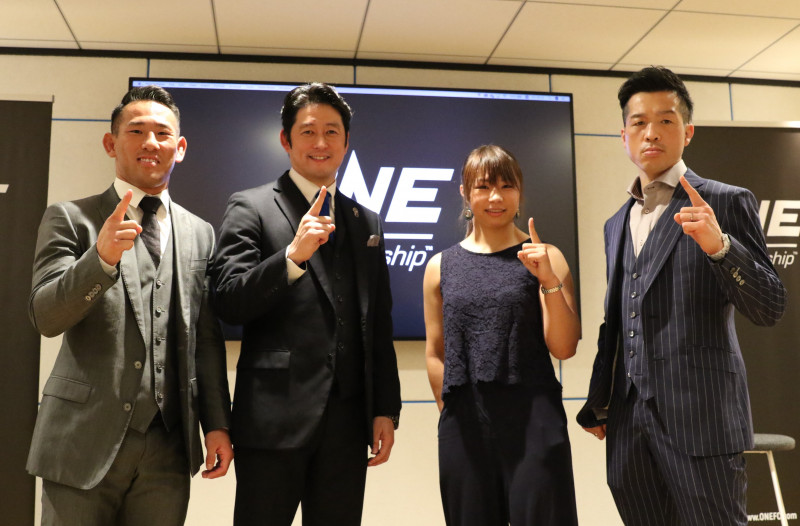 会見に同席した左から高橋遼伍、秦アンディ英之代表、三浦彩佳、健太