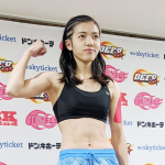 百花が余裕の計量パスで力強くマッスルポーズ