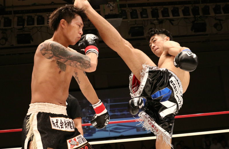 多彩な蹴り技を持つ恭介(右)が初王座獲得を懸け林と対戦