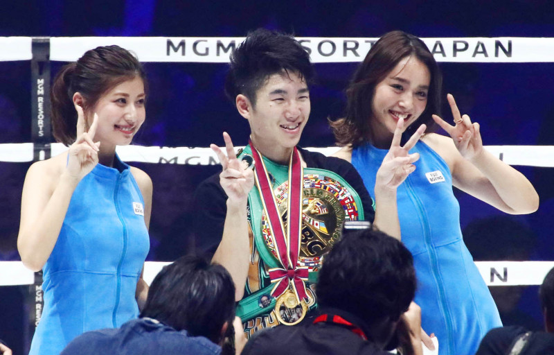 チャーミングにピースサインのリングガールの2人、左は天野麻菜、右は神部美咲。中央に寺地拳四朗