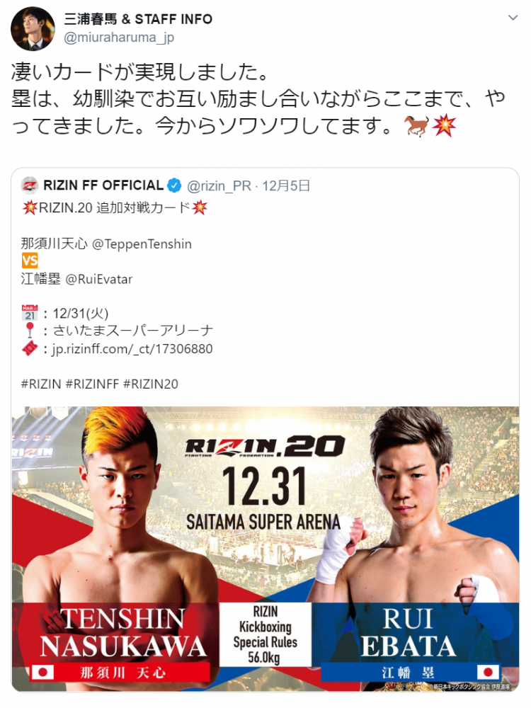 三浦春馬は江幡の対戦決定の際に「今からソワソワしている」とツイート@miuraharuma_jpより