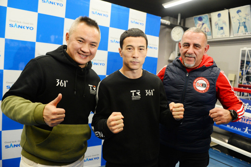 左から劉剛プロモーター、ウラン・トロハツ、トレーナーのペドロ・ディアス