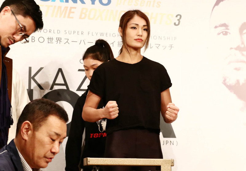 52kgジャストで計量パスし、ガッツポーズをとる吉田実代