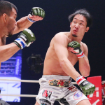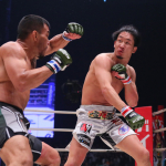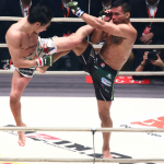 試合終了直前、ジャンピングハイキックを繰り出す朝倉