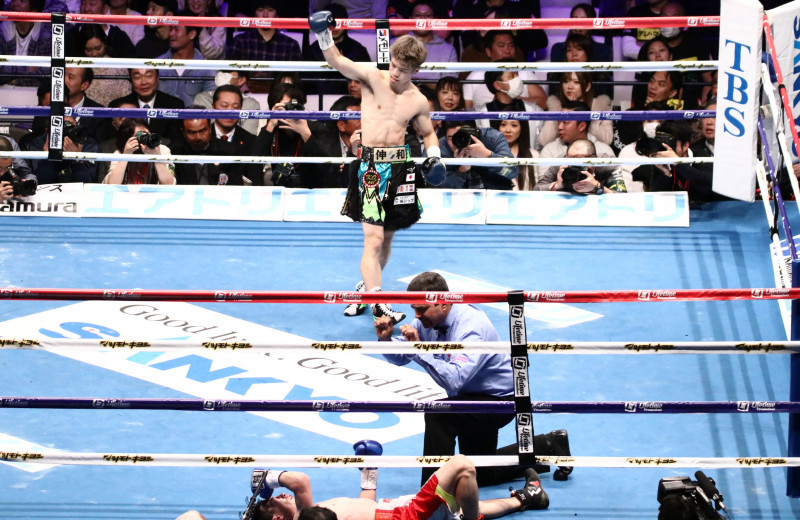 トロハツがマットに崩れて試合終了、田中のV3が決まった瞬間