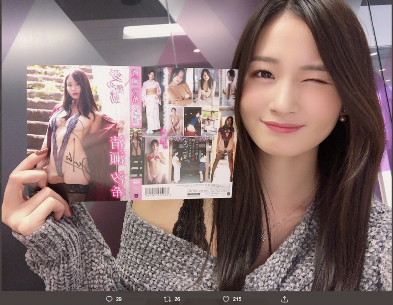 新メンバーとなった身長170cmでGカップの人気グラビアアイドル清瀬汐希。最新イメージDVDを手にウィンク (清瀬汐希Twitter @yuki_kiyoseより)