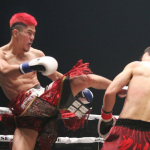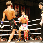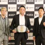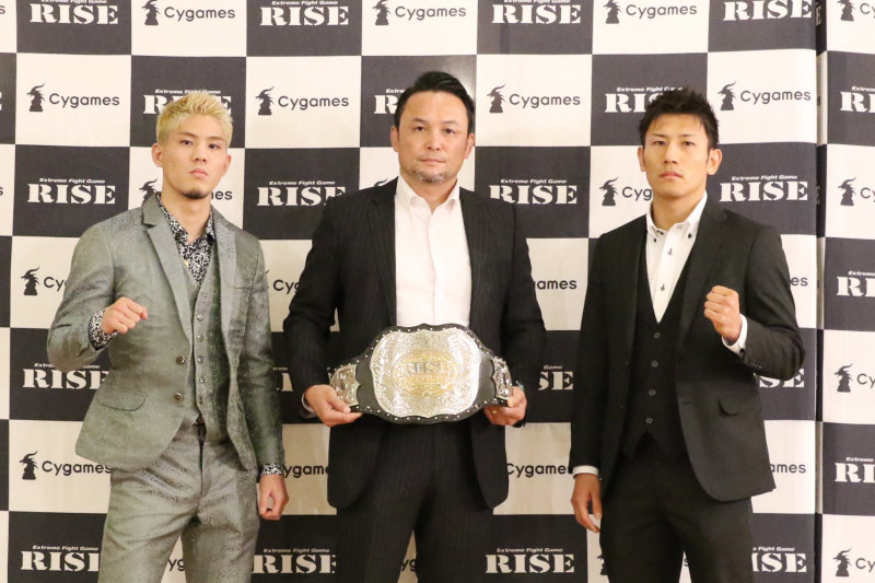 RISEライト級王座を争う秀樹(右)と原口(左)。ベルトを持つのはRISE伊藤代表