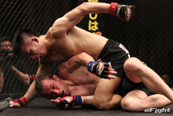 現DEEP王者のビクター・ヘンリー(下)をパウンドで攻め立てる元谷(19年3月)