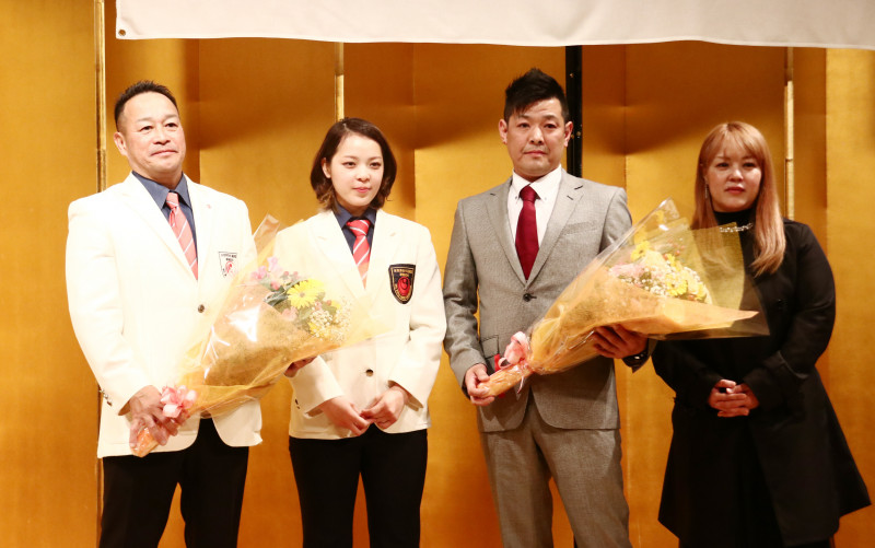 南原が緑代表(左)と両親(右2人)に感謝の花束を渡した