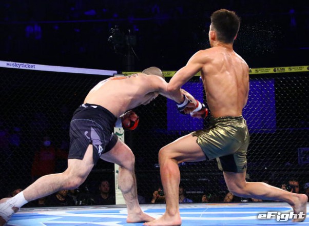 後のUFCファイター・堀江(左)を豪快なフックでダウンさせる田村