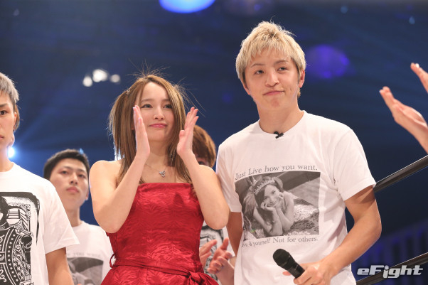 「格闘代理戦争」で妻のサラさんと仲睦まじい様子を見せる久保(19年4月)