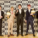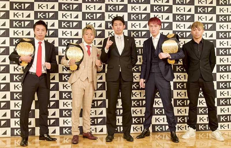 K-1プロデューサー中村氏(中央)を挟み、K-1の顔として活躍する(左から)久保、武尊、安保、不可思が並ぶ