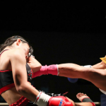 ぱんちゃんの長い脚から繰り出される前蹴りをさばく祥子