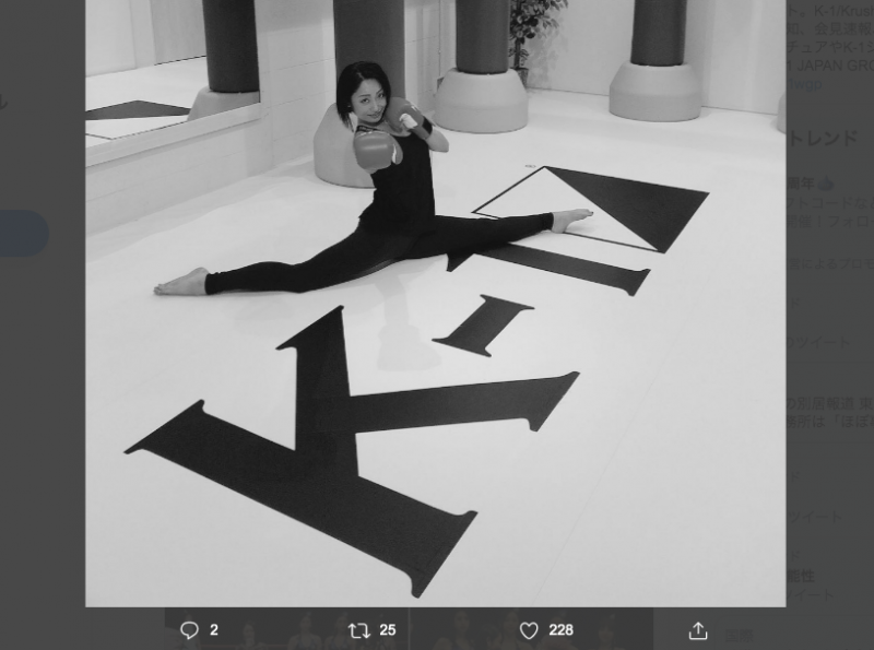 初のキック体験で前後開脚でパンチポーズを決める安藤美姫(@M1K1_ANDO)