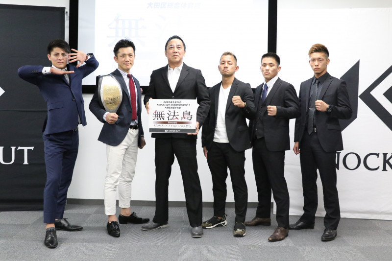 昨年5月より山口代表はKNOCK OUTのプロデューサーに就任、64kgトーナメントなど新たな挑戦を続ける(写真は無法島GP・64kgT出場選手と漫画『無法島』作者の森氏)