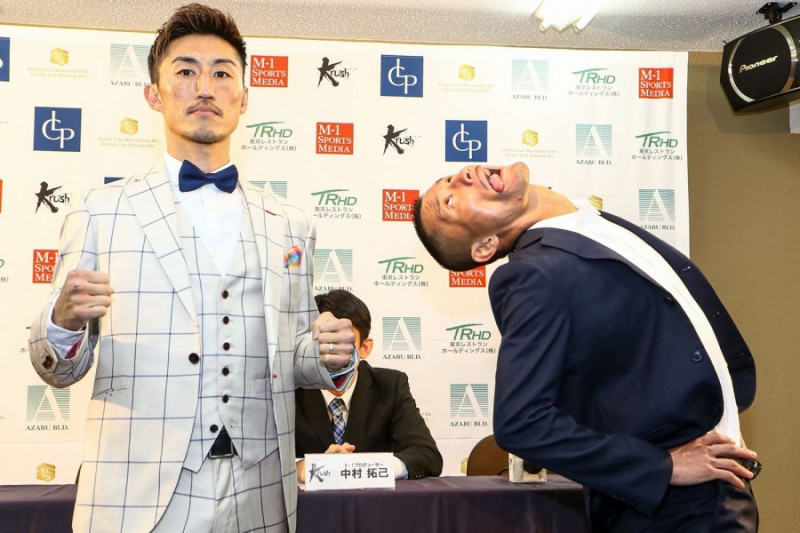 山崎秀晃(左)と独特のポーズで睨みつける堀井(C)M-1 Sports Media