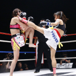 長身のぱんちゃんにも臆さずハイキックを蹴り込む(19年8月)