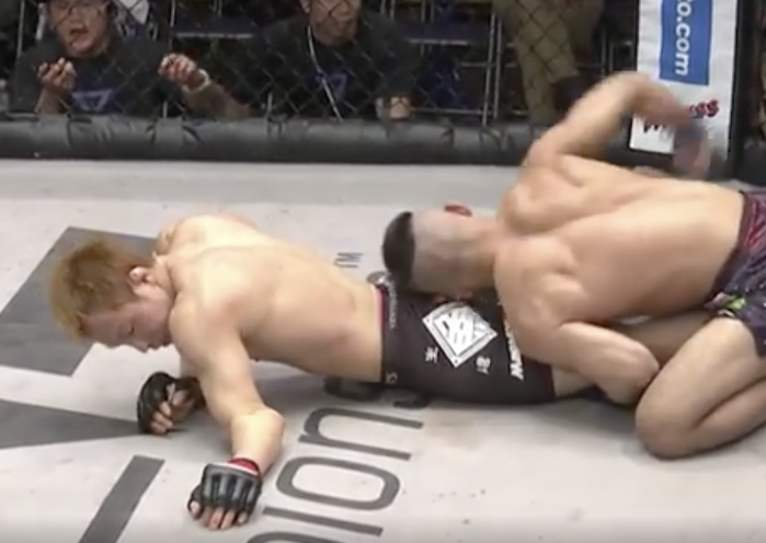 上から落ちた瞬間、肘が反対側に曲がった魚井。このあとすぐにタップをする(AbemaTV)