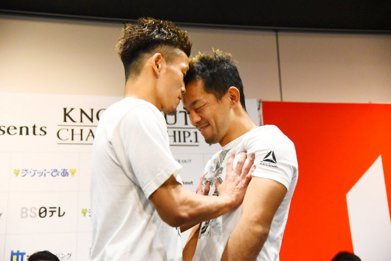 1回戦相手・バズーカ(左)に会見で突き飛ばされるも笑顔の橋本
