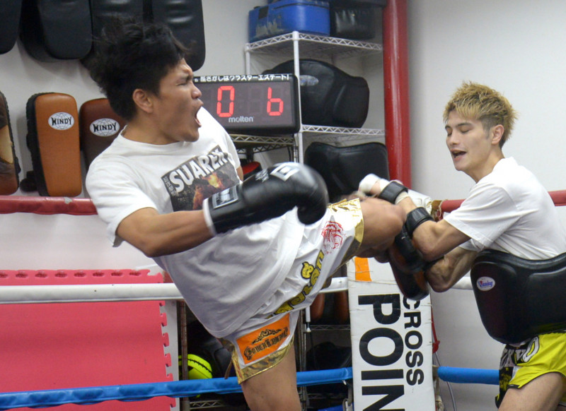 スアレックの強烈なミドルをミットで受ける栗秋