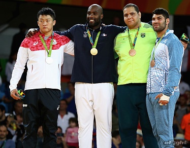 リオ五輪の表彰式でのリネール(中央)、左は銀メダルの原沢久喜(日本)写真=eFight/getty