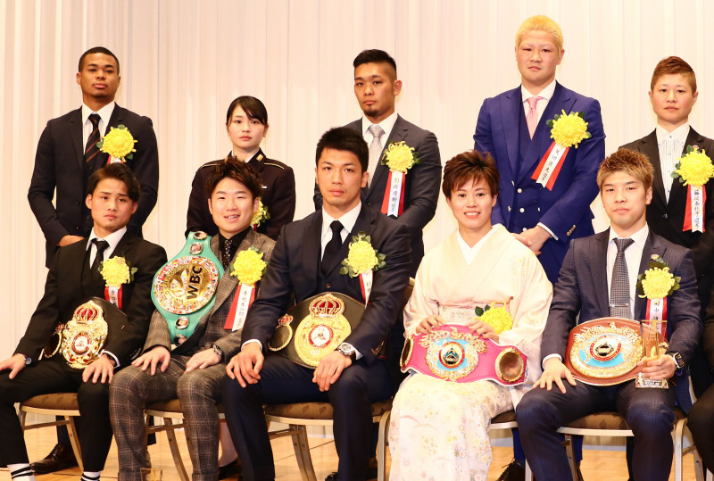 年間表彰で前列左から世界王者の京口紘人、寺地拳四朗、村田諒太、天海ツナミ、先日世界王座を返上し4階級制覇を狙う田中恒成