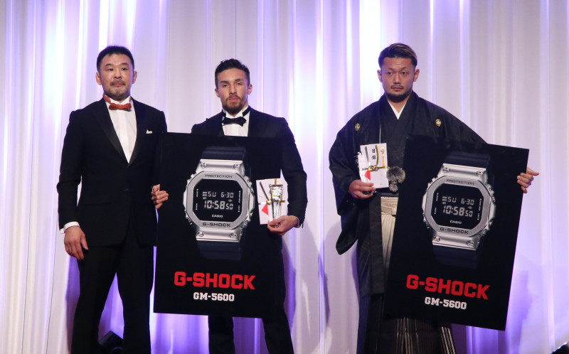 左からプレゼンターの桜庭、受賞した木村、愛鷹