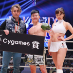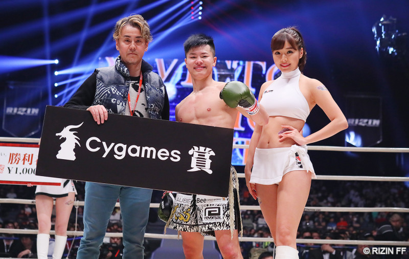 昨年の大晦日にKO勝利し各賞を受賞、ラウンドガールの川村那月も花を添える