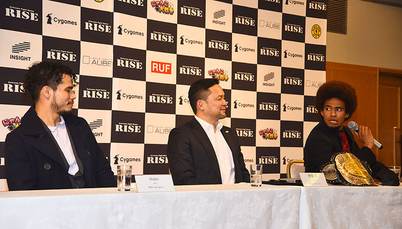 会見でRISE伊藤代表を挟み、挑発合戦を繰り広げたベイノア(右)とHideki(左)