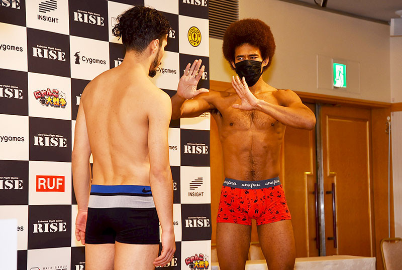 近づこうとするHideki(左)に「近寄るな」とばかりに手を突き出すベイノア