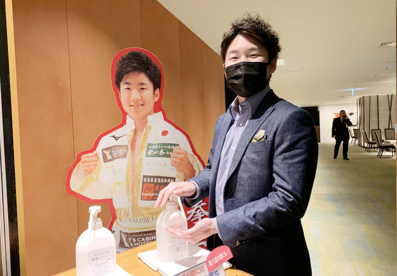 アルコール消毒で会場入りが徹底された祝勝会、拳四朗もアルコール消毒し会場入り。