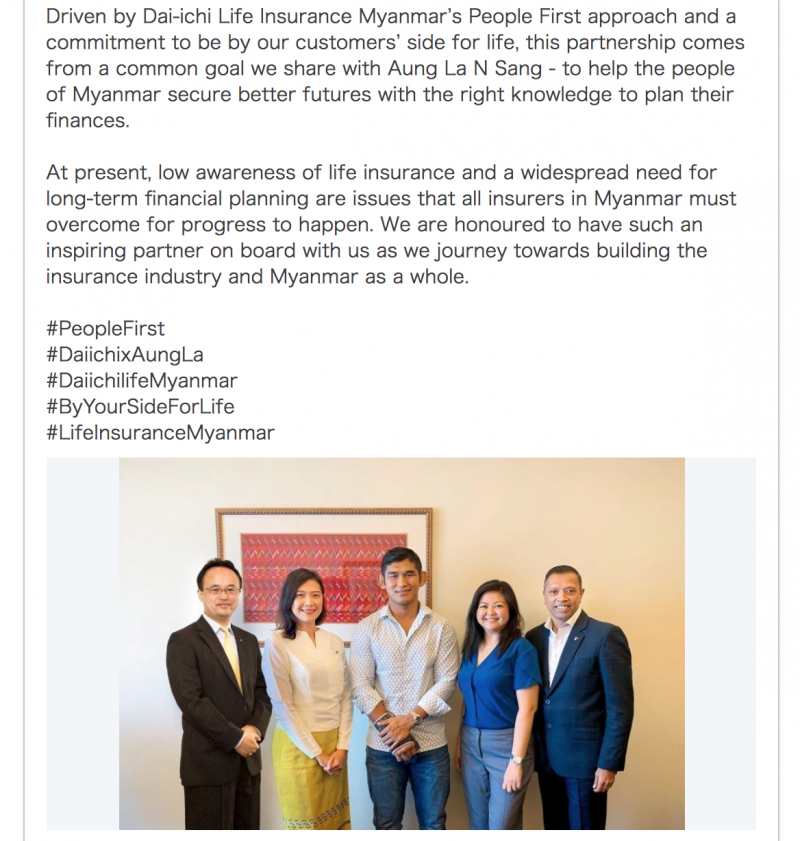 ンサンのブランド大使を発表した第一生命ミャンマーのSNS