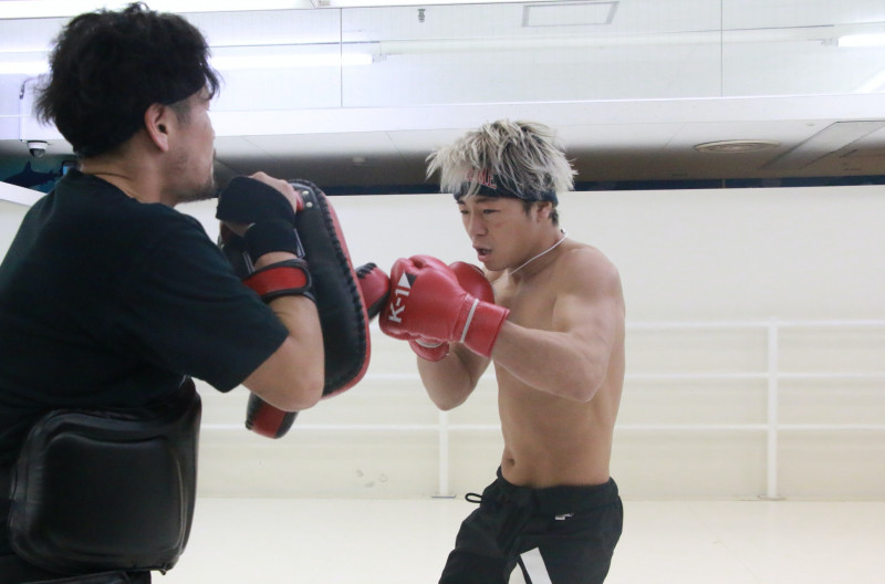 豪快なフックを打ち込んでいく武尊(右)