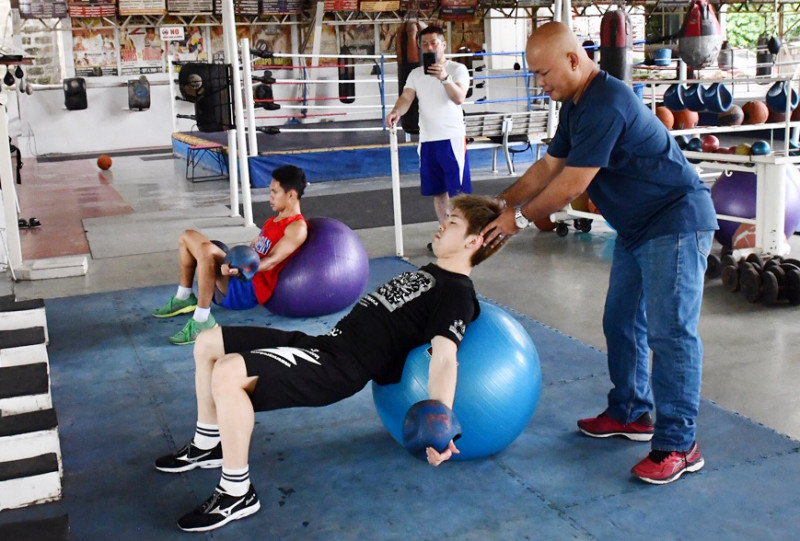 バランスボールを使ったフィジカルトレーニングも行う