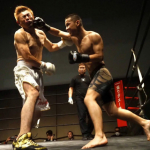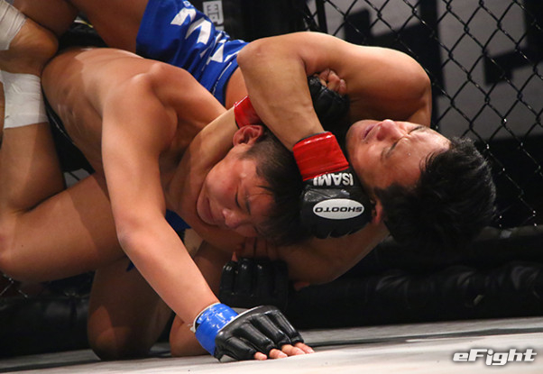 昨年3月、スリーパーで1R一本勝ちした牧ヶ谷(右)