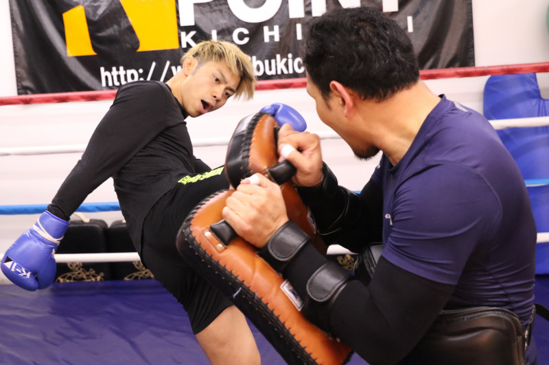 タイ人トレーナーの持つミットへシャープで強烈なミドルキックを打ち込む不可思