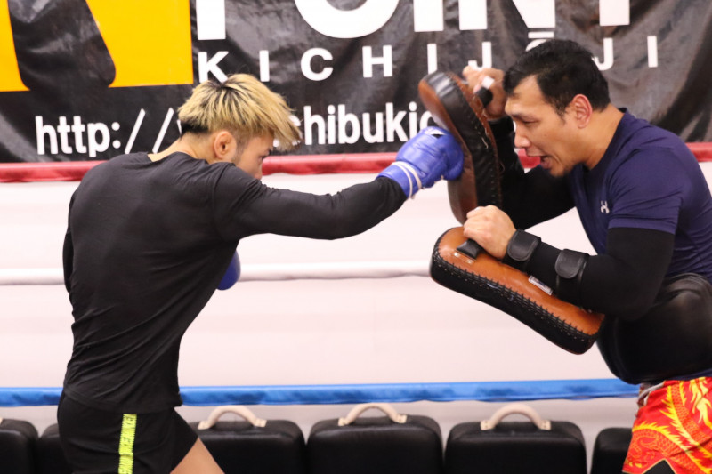 ミット打ちで見せたコンビネーションの中の右ストレート、ヒットマッスルの盛り上がりから威力がうかがえる