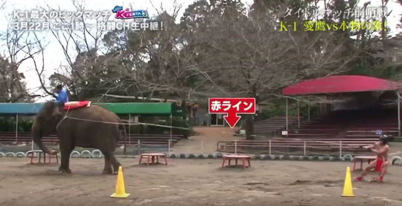 ゾウとの綱引きに赤フン姿でふんばる愛鷹