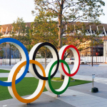 五輪のオブジェとほぼ完成した新国立競技場=20年3月18日撮影