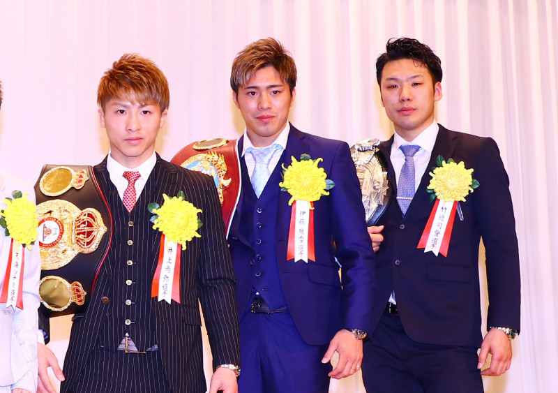 4度目の日本防衛戦に挑む竹迫 司登(右)。写真は19年2月の年間優秀選手表彰式賞で新鋭賞受賞。左は井上尚弥、中央は伊藤雅雪