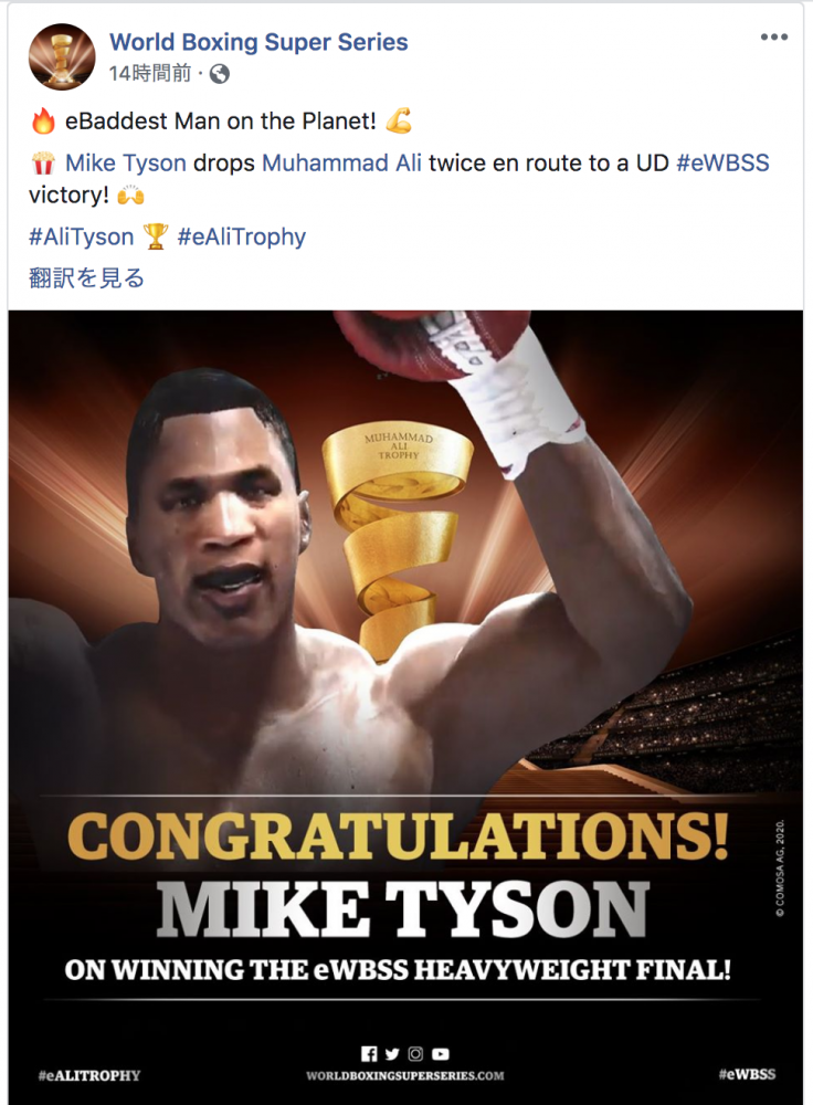 優勝し、アリトロフィーを背に喜ぶマイク・タイソン(c)WBSS FaceBook