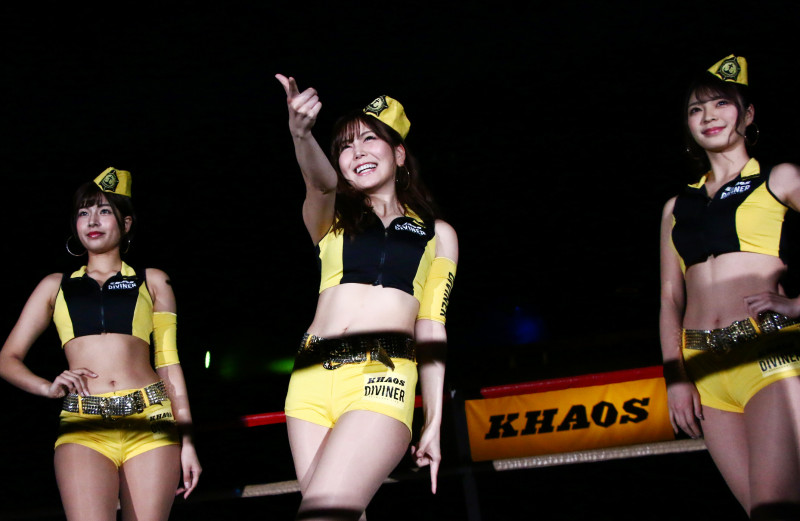 リングで紹介される水瀬さんは明るい笑顔で応える。左は藤井マリー、右は芹沢まりな