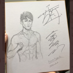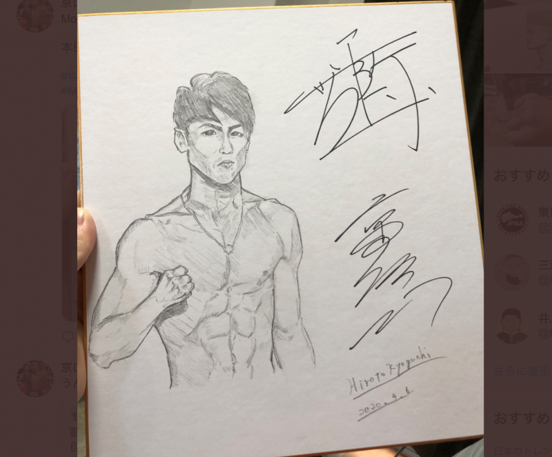井上尚弥の似顔絵に、井上本人のサインが入った=@HirotoK1127より