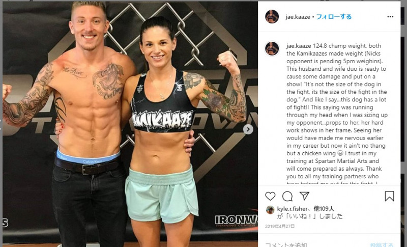 理解し送り出すイケメン夫のニック氏(左)。彼もMMAファイターだ(@jae.kaazeより)