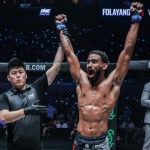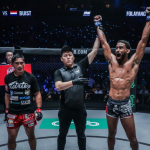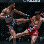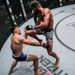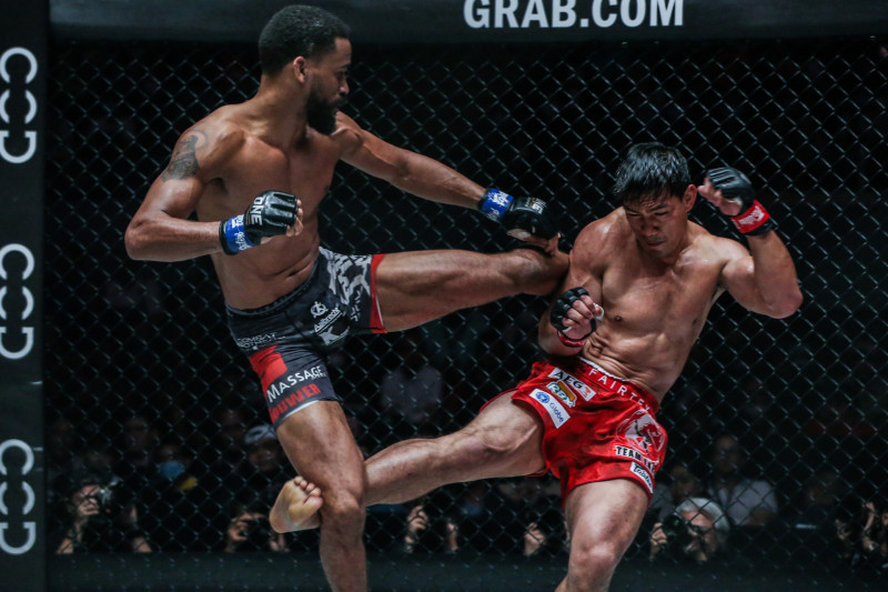 バウシュト(左)が元世界王者フォラヤンに対し、長いリーチからの蹴りで攻める©️ONEChampionship
