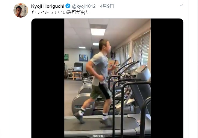 4月9日にはランニングマシーンで走る動画を投稿し、ファンを喜ばせた@kyoji1012より
