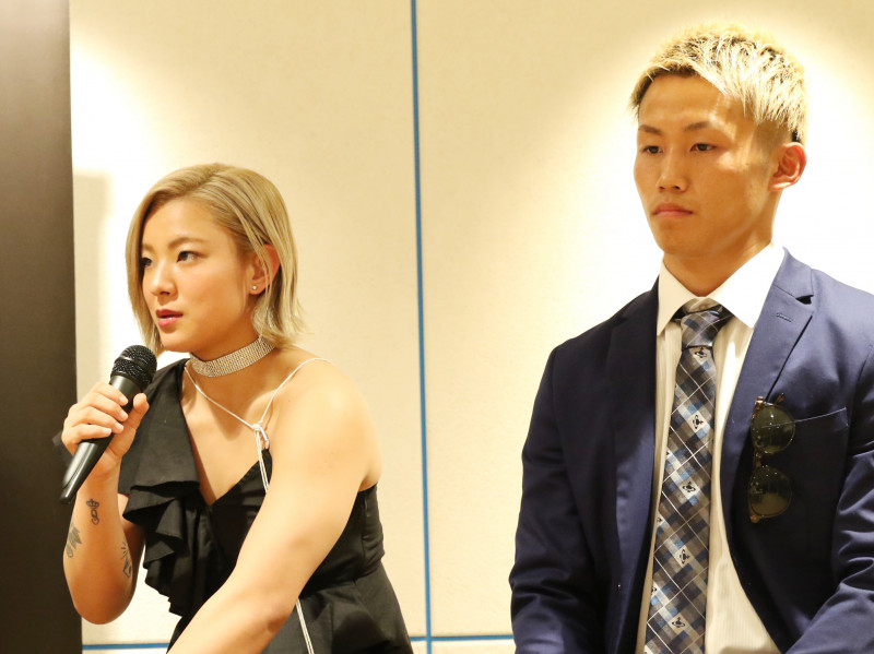 ドレスアップして会見に臨む平田樹(左)と内藤大樹