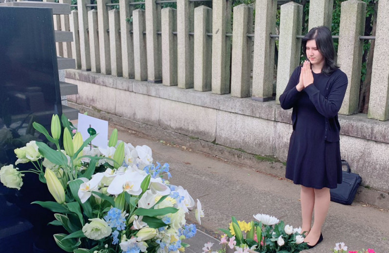 4月26日、祖父、大山倍達の命日であり、自身の誕生日に喪服を着て墓前に手を合わせる大山桃加林さん
