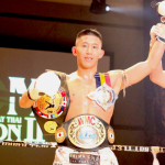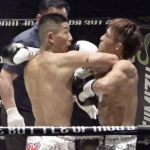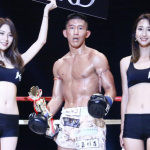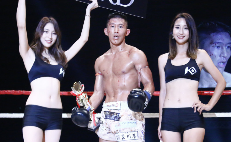 試合後の血を浴びた雅の顔と隣の綺麗なラウンドガールとの対比からも試合の激闘ぶりがわかる