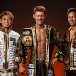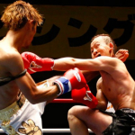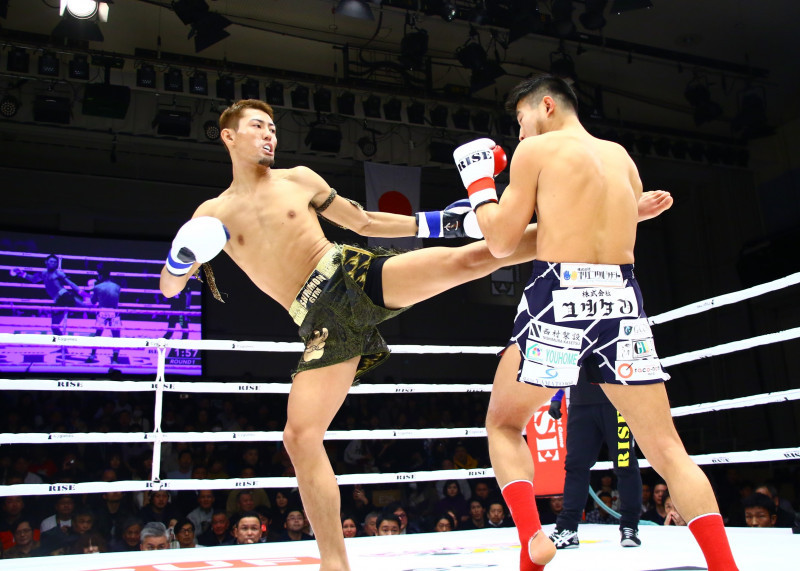 一眞(左)の強烈な左ミドル=2020年1月のRISE初参戦